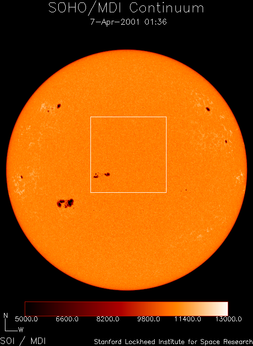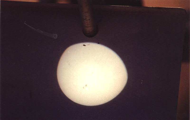 This is an enlarged photo of the sunspot we reviewed during the Delta II/Odyssey launch. The upper dark spots are not actual sun spots, but markings on the sun screen. The actual sun spots are to the lower portion of the sun image. Due to the sun not being centered in the telescopes' field of view, the sun appears to be "out-of-round". (The Earth had moved us out of direct view, due to it's rotation) Below is a NASA photo taken of this same sunspot, on the same day, about 6 hours earlier. |
